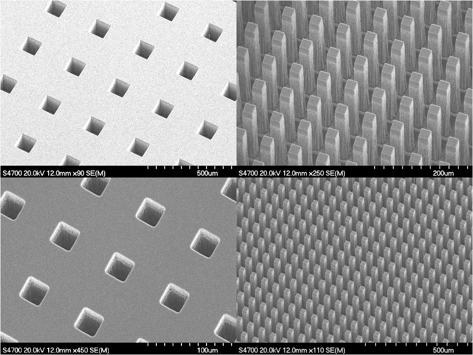 SEM of vias and posts for ~150um deep etch