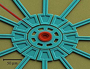 The image is a colorized Scanning Electron Micrograph (SEM) of a salient-pole electrostatically actuated micromotor made from polycrystalline silicon using surface micromachining techniques. The central rotating element of the motor (e.g., the rotor) is the circular structure in the middle (shown in blue) held to the substrate by the central bearing (which is shown in red). Properly phased voltage potentials are placed on the motor stators (typically 120 degrees advanced in phase sequentially around the stators), which are equally spaced around the perimeter of the rotor (also shown in blue) and these applied voltages on the stators cause the central rotor to turn around the bearing at extremely high angular velocities. This device was made through the MEMS and Nanotechnology Exchange fabrication network.
